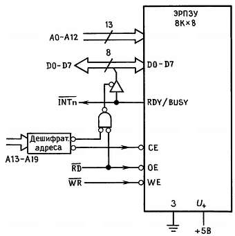 Первые ЭРПЗУ требовали повышенных напряжений и длительной процедуры программирования. Современные микросхемы используют одно напряжение питания +5 В и работают практически так же, как и статические ОЗУ-другими словами, вы можете репрограммировать любой байт с помощью одного цикла записи на магистрали. В микросхеме ЭРПЗУ предусмотрены внутренние цепи для генерации повышенного программирующего напряжения, а внутренняя логика фиксирует данные и генерирует программирующую последовательность длительностью несколько миллисекунд, в которой на время процесса устанавливается флаг BUSY' или в цикле чтения образуются инвертированные данные, чтобы показать, что идет процесс записи. Некоторые ЭРПЗУ реализуют оба этих протокола, обычно называемые "RDY-BUSY" и "DATA'-опрос". Сопряжение с этими ПЗУ осуществляется просто - достаточно подключить их так же, как обычные ОЗУ и использовать линию BUSY' для возбуждения прерываний (либо считывать состояние BUSY' или данных, и использовать его как флаг состояния) (см. рис. 11.34).