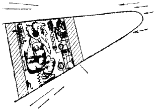 А теперь давайте заглянем в более отдалённое будущее. Лично я вообще не могу понять, почему астронавты мечтают попасть в межзвёздное пространство. В ракете ведь будет страшная теснота. Да и в питании им придётся себя сильно урезать. Но это ещё полбеды. Главная неприятность — что астронавт в ракете будет находиться в том же положении, что и человек, помещённый против пучка быстрых протонов, выходящего из мощного ускорителя (посмотрите рисунок). Очень мне жаль бедного астронавта; о его печальной участи я даже сочинил балладу[18]: