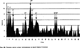Доказав еще раз, что можно установить геометрическую схему, которая могла бы связать объекты между собой, я приступил к более детальной оценке углов между объектами (рис. 68). Первоначально я проанализировал все углы между кругом Стэннон и 22 другими объектами съемки. На этот раз я решил, что поскольку я имею дело с углами между прямыми линиями, все углы следовало рассчитать заново таким образом, чтобы они разнились от 0° до 90° Все тупые углы (углы больше 90°) должны быть представлены их острыми эквивалентами. Например, угол в 120° будет представлен так 180°-120° или 60°.