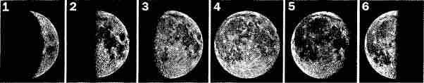 Рис. 1.5. Фотографии Луны в различных фазах: 1 — молодая Луна (лунный серп, полумесяц), своей выпуклой стороной он всегда обращен в сторону Солнца; 2 — первая четверть; 3 — растущая Луна; 4 — полнолуние; 5 — убывающая Луна; 6 — последняя четверть.