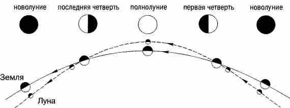 Рис. 1.6. Последовательные положения Земли и Луны на своих орбитах и соответствующие им фазы Луны с точки зрения земного наблюдателя.