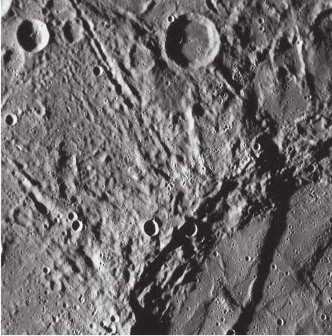 Снимок участка поверхности Меркурия, полученный АМС «Мессенджер» 14 января 2008 г.