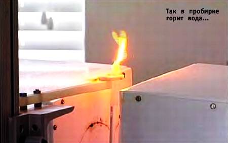 …Демонстрация этого устройства выглядит, как цирковой трюк. В обычную пробирку наливают обычную морскую воду, чиркают спичкой — и над пробиркой появляется голубое пламя.