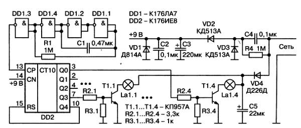 Генератором здесь является микросхема DD1, конденсатор С1 и резистор R1, источник питания — диоды VD1—VD3, конденсаторы С2—С4 и резистор R4. Четыре одинаковых комплекта R2, R3, VT1 образуют цепи управления лампочками.