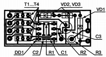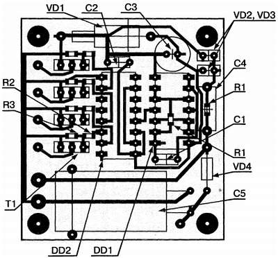 Аналоги. Если микросхемы К176ИЕ8 у вас не окажется, ее можно заменить зарубежным аналогом CD4017 или подобной ему. В серии К561 есть похожая по функциональности микросхема К561ИЕ9 (зарубежный аналог CD4022), но у нее несколько другое расположение выводов, и под нее придется переделывать плату.