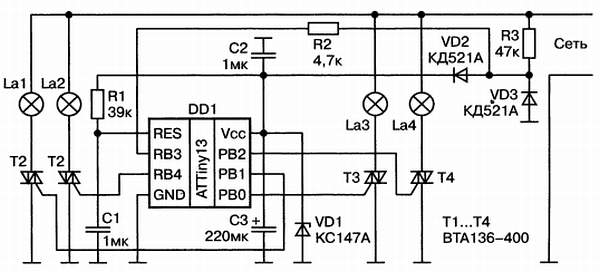♦ четыре мощных выходных каскада, управляющих лампочками (чтоб мигало).