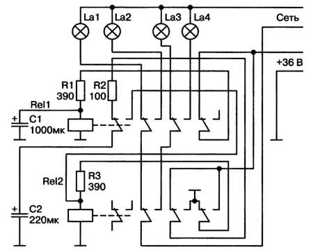 Рис. 1.9. Схема варианта «бегущих огней» на электромагнитных реле