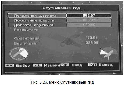 В ресивере Big Sat BS-S501 есть полезная функция автоматического определения координат и углов поворота тарелки, которая доступна в меню Спутниковый гид (рис. 3.26).