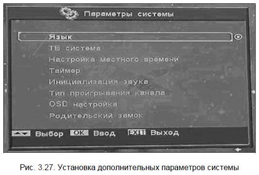 Дополнительные параметры системы, такие как родительский замок, пароль, язык и пр., устанавливают в соответствующем меню (рис. 3.27).