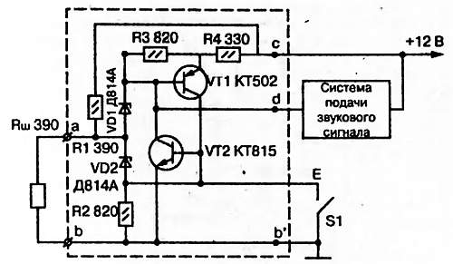 Резистор Rш размещается внутри охраняемого помещения и соединен с гнездами а, b входного устройства двухпроводной линией. В исходном состоянии оба транзистора заперты. При обрыве линии через резистор R1 и стабилитрон VD2 на базу транзистора VT2 поступает отпирающее напряжение от источника питания. Это приводит к отпиранию транзистора VT1, и такое состояние схемы устойчиво. Контакт d через открытый транзистор VT2 заземляется и включается тревога.