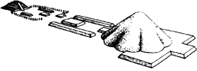 Главная пирамида Ла-Венты стояла у южной окраины поселения. Почти круглая на нулевой отметке, она имела вид гофрированного конуса, на боковой поверхности которого чередовались идущие вдоль образующей десять выступов и впадин. Пирамида достигала 30 метров в высоту и почти 60 метров в диаметре. Общий объем ее составлял около 8000 кубометров — монумент вполне внушительный. Остальная часть комплекса имела протяженность почти полкилометра. Ось ее симметрии отклонялась точно на 8° от направления на север. Абсолютно симметрично от этой оси размещались несколько меньших пирамид, площадок, платформ и курганов, занимавших общую площадь около 8 квадратных километров.