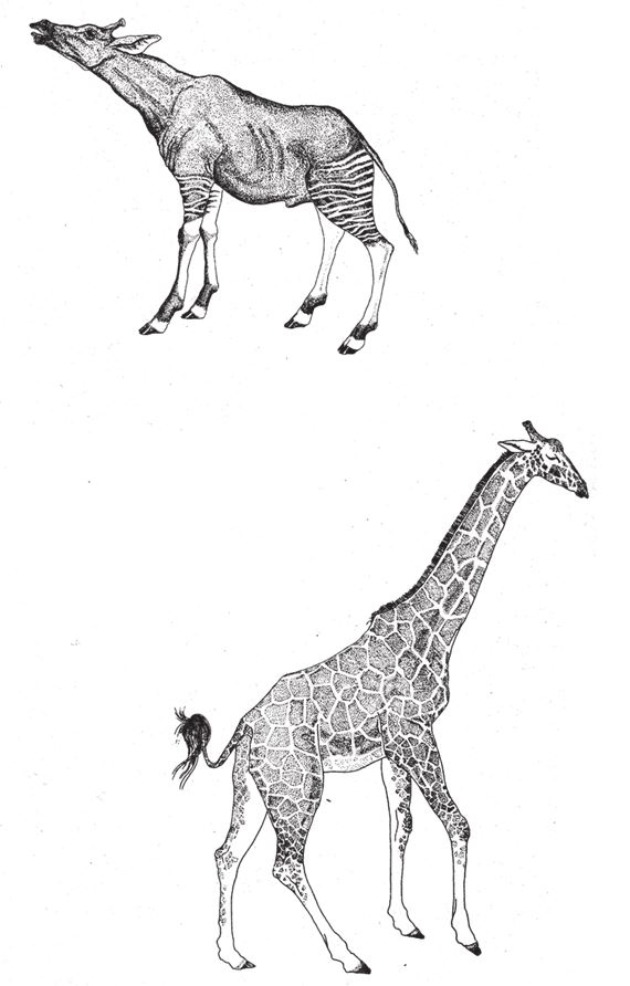 Рис. 3.3. Развитие длинной шеи. Окапи, Okapia johnstoni, возможно, предок современного жирафа, и жираф, Giraffa camelopardalis reticulate.