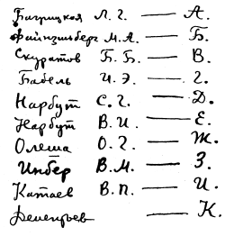 В материалах, собранных Г.И. Поляковым, образ Багрицкого предстает именно в неканонизированном варианте. Он создан прежде всего на основе устных рассказов – «бесед» с родственниками, друзьями и знакомыми поэта. Их имена закодированы. Однако среди страниц текста, к счастью, оказался написанный от руки листочек, своеобразный «ключ-дешифратор», позволяющий определить круг опрошенных лиц. Чтобы не нарушать жанровое своеобразие исследования, мы не стали вносить фамилии в текст, оставив буквенные обозначения «персонажей».