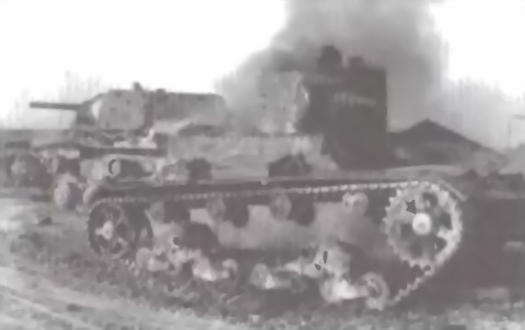 Легкий танк Т-26 обр. 1933 г. и экранированный танк КВ-1, подбитые на Северо-Западном направлении летом-осенью 1941 г.
