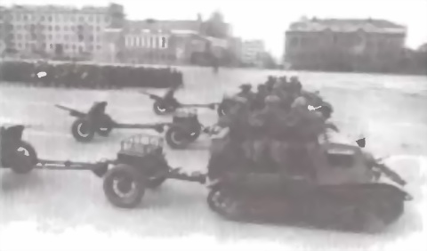Артиллерийские тягачи СТЗ-5 буксируют дивизионные пушки ЗИС-22 УСВ. Москва 1 мая 1941 г.
