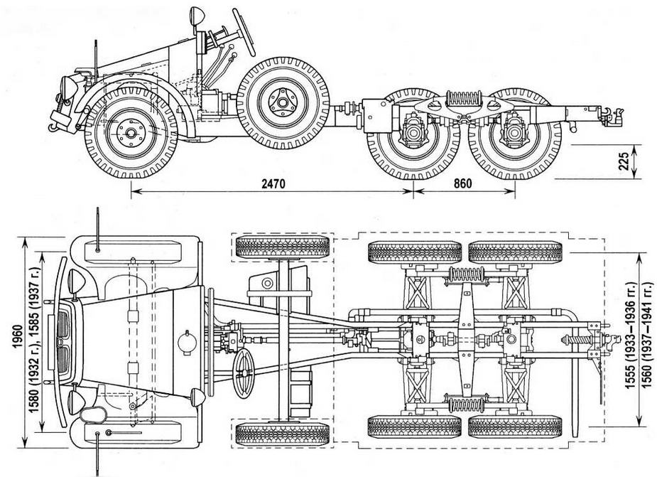 ХОДОВАЯ ЧАСТЬ: привод на две задние оси, колёсная формула 6x4, передняя подвеска — жёсткий мост, полуэллиптические рессоры, задняя — два жёстких моста, по обеим сторонам по две полуэллиптических рессоры, рулевой механизм — «ходовой винт», шины — 6.00x20".