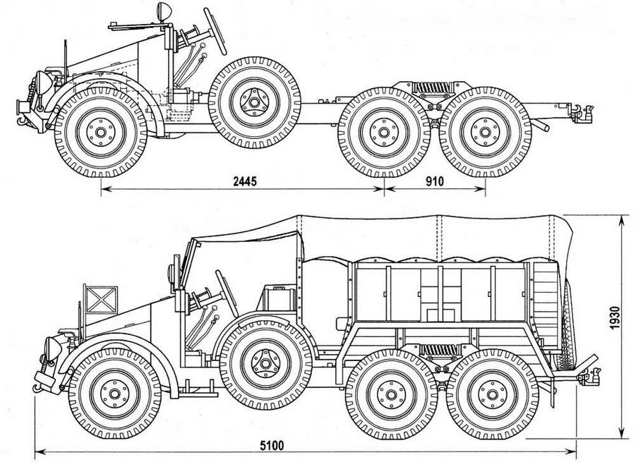 Автомобиль имел три оси — с приводом на две задние по колёсной формуле 6x4. Все мосты были жёсткого типа, с полуэллиптическими рессорами. Максимальная скорость на шоссе с грузом 1,5 т достигала 60 км/ч: двигатель — Bussing-NAG G мощностью 65 л.с., карбюраторный.