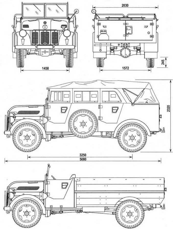 ГАБАРИТНЫЕ РАЗМЕРЫ, мм: грузовой автомобиль: длина — 5350, ширина — 2250, высота — 2350, клиренс — 225; машина связи: длина — 5700, ширина — 2220, высота — 2350.
