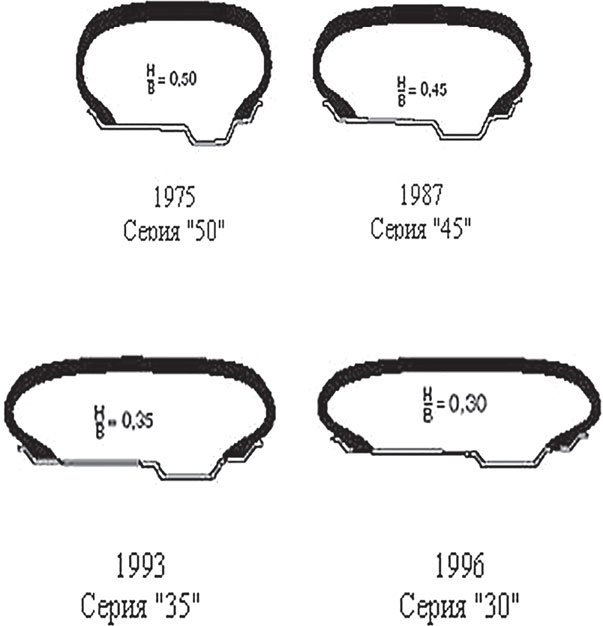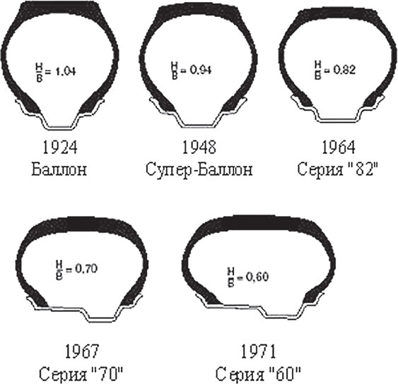Повсеместно различными шинными фирмами стало уделяться значительное внимание обеспечению высоких сцепных свойств шины как на сухом, так и на мокром дорожном покрытии. Поэтому в 60 годы прошлого века значительное изменение претерпела такая характеристика конструкции шины, как отношение высоты шины (Н) к ее ширине (В). Первые шины представляли в разрезе почти правильный круг, высота которого равнялась ширине. Затем высота стала последовательно уменьшается.