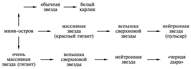 Когда горючее исчерпывается, звезда начинает коллапсировать. Электроны останавливают коллапс обычной звезды. В недрах более массивных звезд гравитационное давление уменьшает расстояние между частицами до такого, в пределах которого начинает действовать слабая сила. Протоны начинают объединяться с электронами, превращаясь в нейтроны. Последние предотвращают дальнейший коллапс. «Внешние области звезды выбрасываются во внешнее пространство, и огромное количество энергии освобождается в таком процессе. Яркость звезды увеличивается на много порядков. Когда смотрят издалека, звезда кажется взорвавшейся, и такое явление называют вспышкой сверхновой звезды. Это то самое время, когда производятся самые тяжелые элементы из-за экстремальных температур, которые достигаются в этот период»[48]. «Быстрое сжатие (коллапс) железного ядра звезды приводит к образованию нейтронной звезды радиусом около 10 км и плотностью вещества, достигающей сотен миллионов см3»[49]. Энергия вращения преобразуется в направленное радиоизлучение, благодаря которому эти объекты были обнаружены в 1967 г. и названы пульсарами. Пульсары — космические источники радио-оптического, рентгеновского и гамма-излучения, приходящего на Землю в виде периодически повторяющихся всплесков. У радиопульсаров (быстро вращающихся нейтронных звезд) периоды импульсов — 0,03-4 с., у рентгеновских пульсаров (двойных звезд, где к нейтронной звезде перетекает вещество от второй, обычной звезды) периоды составляют несколько секунд.