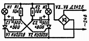 Схема этого переключателя (рис. 1) представляет собой симметричный мультивибратор, собранный на двух тиристорах, в анодные цепи которых включено по одной гирлянде. Каждая гирлянда может содержать параллельное, последовательное или смешанное соединение ламп, но оно должно быть рассчитано на напряжение 24 В и номинальный ток 5 А. Питание устройства производится переменным напряжением 24 В через диодный мост.