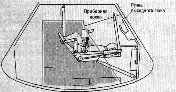 Рис. 6.2. Схема размещения астронавтов в командном модуле (СМ) корабля «Аполлон». Это основной отсек экипажа, в котором пилот модуля проводит весь полет, а командир экипажа и пилот лунного модуля (LM) покидают его только на время визита к поверхности Луны.