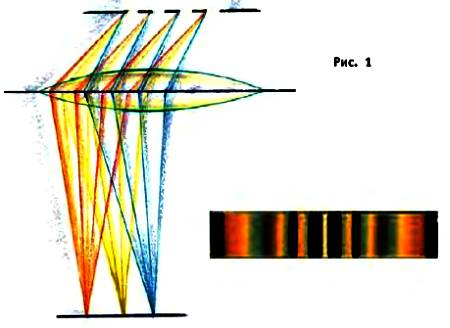 Обычный белый свет — это смесь световых лучей разных длин волн, а значит, и разного цвета. Проходя через щель, свет испытывает дифракцию, и составляющие его лучи перераспределяются. Так, синий луч отклоняется на один угол, зеленый и желтый — на другой, красный — на третий, самый большой. Очень важно, что эти отклонения в каждой из щелей одинаковы. (Происходит это потому, что каждая из них имеет одну и ту же ширину.) В результате мы имеем систему параллельных лучей разного цвета.