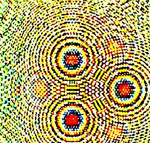 Таким же способом можно показать дифракционную картину на отверстии. Делают рисунок, состоящий из множества круглых одинаковых точек. Его фотографируют и получают негатив из множества отверстий на темном фоне. Каждое отверстие дает свою дифракционную картину, а все они складываются на экране в яркую картину при помощи линзы.
