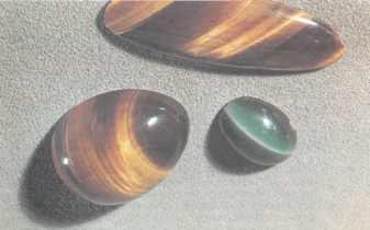 Обязательно надо упомянуть и о кристаллах кварца, развивающихся прямо по другим минералам, принимая их форму. Так возникают, например, хрупкие конструкции замещения кварцем тонких листочков бумажного шпата-кальцита или замечательные переливчатые ювелирные камни: тигровые, кошачьи или соколиные глаза. Кварц в таких «глазах» замещает тонковолокнистый минерал амфибол. Шелковый отлив остается от амфибола, но появляется твердость кварца и способность принимать и сохранять полировку.