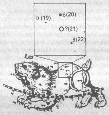 Рис. 4. Звезда, описанная К. Птолемеем в «Альмагесте» за номером 21 в созвездии Льва и изображенная на гравюре А. Дюрера 1515 г., отсутствует среди светил, видимых невооруженным глазом (ее место показано кружком на современной звездной карте). В скобках даны номера звезд по К. Птолемею.