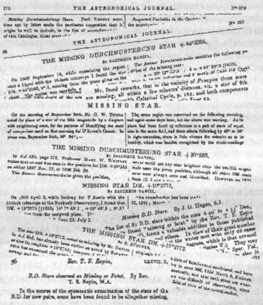 Сообщения о пропавших звездах стали нормой для XIX века (рис. 5). Особенно много «пропаж» связано с наиболее обширным звездным каталогом того времени — «Боннским обозрением» (BD), составленным в 1852–1859 гг. Несмотря на легендарную немецкую педантичность и аккуратность его авторов (руководитель Ф.В.А. Аргеландер), среди 325037 звезд в каталоге обнаружилось не менее 79 объектов, которые так и не удалось разыскать на небе.