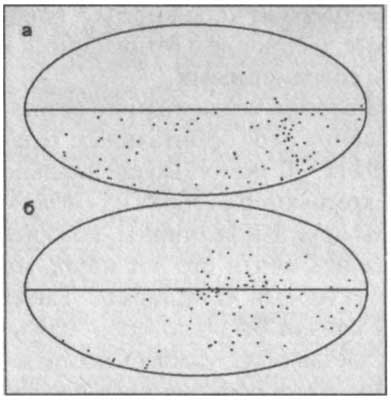 Быть может, это дефекты фотопластинок и астероиды? Но речь идет лишь об объектах, которые были сфотографированы на одном и том же месте по 2–5 раз. О том, что «пропадали» именно звезды, говорит и распределение пропаж на небе. Компьютер выявил, что исчезнувшие светила концентрируются не к эклиптике (рис. 7а), к которой тяготеют астероиды, а к экватору Галактики (рис. 7б). Особенно озадачивают случаи, когда относительно яркие звезды 7–8 величин фотографировались по 3–5 раз и пропадали далеко, как от эклиптики, так и от Млечного Пути, где возможны миражи из слившихся изображений близких звезд. С этой точки зрения особенно интересны четыре звезды «Астрографического каталога»: АС 2204592, АС 2638938, АС 3161069 и АС 4427840.
