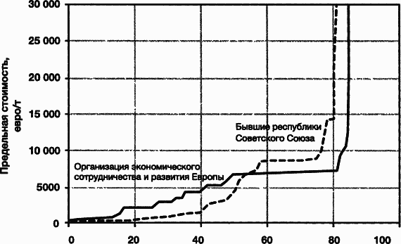Загрязнитель воздуха — оксиды азота NOx — можно извлекать из выбросов по низкой цене до определенного значения, однако для высоких степеней очистки расходы начинают стремительно расти. Кривая предельной стоимости извлечения оксидов азота NOх рассчитана для 2010 г. для Организации экономического сотрудничества и развития Европы и для бывших республик Советского Союза в евро на тонну извлекаемых веществ. (Источник: т. Аlсато еt аl.)