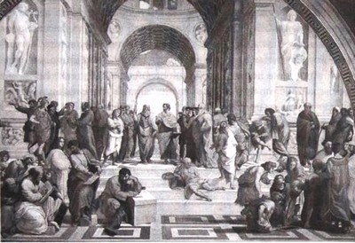Рис. 2.3. Фреска Рафаэля, изображающая философа Платона со своим самым знаменитым учеником Аристотелем во время дискуссии в Афинской Академии. Платон указывает пальцем вверх, на небо, а подход Аристотеля более приземлен. Гипатия (жившая несколькими веками позже), одетая в белое платье, стоит внизу слева, одна, повернувшись к зрителям, в окружении мужчин.