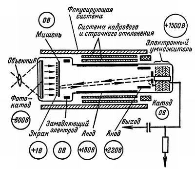 В результате вылета вторичных электронов на мишени создаются положительные заряды, величина которых тем больше, чем сильнее освещены соответствующие элементы фотокатода. Эти заряды проходят сквозь тонкую мишень и нейтрализуются электронами перемещающегося луча, направляемого на мишень электронной пушкой.