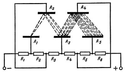 Рис. 196. Электронный умножитель, содержащий пять анодов с последовательно возрастающими потенциалами.