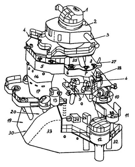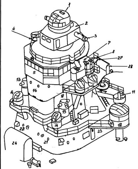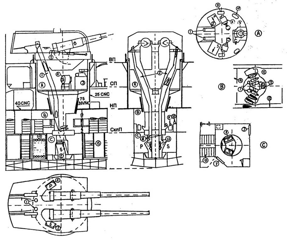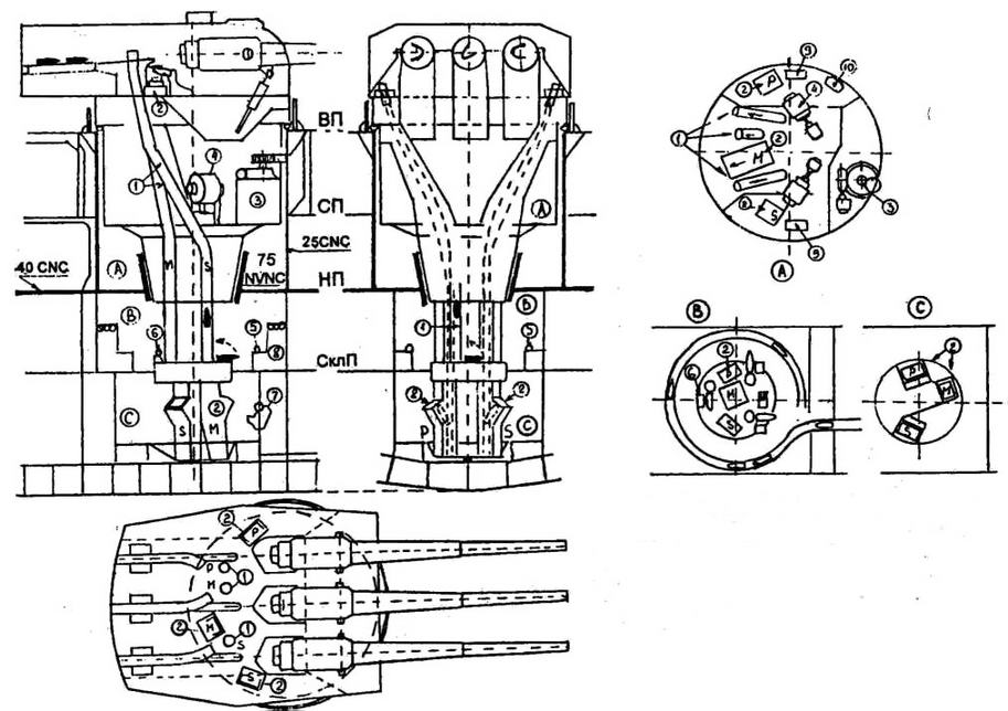 1,2- снарядный “толкательный” и зарядный “ковшовый” подъемники; 3 - привод поворота башни; 4 - электромотор (100 л.с.) с масляным насосом; 5,6 - снарядные лоток и жело; 7 - пламянепроницаемый коллектор; 8 - снарядный бункер; 9 - масляный бак; 10 - аккумулятор; 11,12 - каретка и лоток для снарядов; 13 - двойные пламянепроницаемые двери; 14 - снарядные погреб; 15 - стеллажи с зарядами