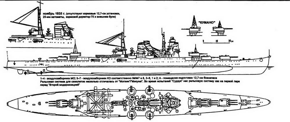 “МОГАМИ’“МИКУМА” (вверху) “СУДЗЯи,“КУМАНО” (внизу) ПОСЛЕ “ТРЕТЬЕЙ МОДЕРНИЗАЦИИ” 1939 ГОДА