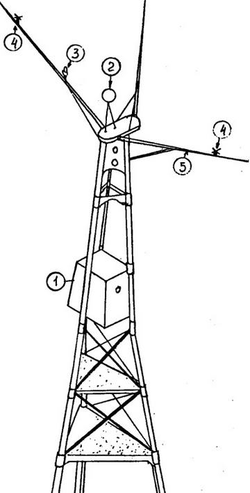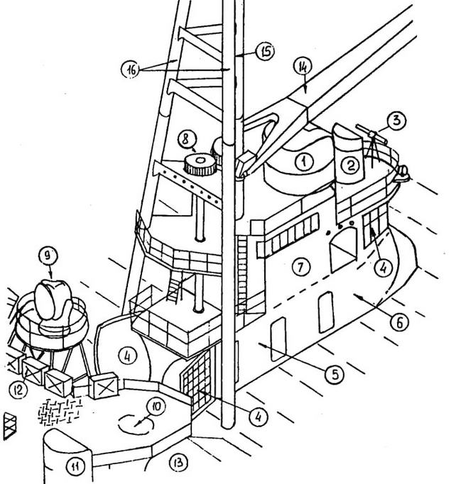 1,2- гониометрический пост и антенна; 3 - 2-кВт сигнальные огонь (такой же на топе грот-мачты); 4 - анемометр; 5 - рей