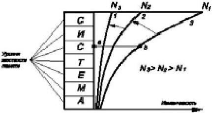 Самоорганизующаяся система условно изображена в виде вертикального прямоугольника, разделенного тонкими линиями на уровни памяти. Чем менее подвержена изменчивости информация на уровне, тем ниже по ординате (более глубоко) он расположен. Это отражает также кривая изменчивости 3, расположенная справа. Отрезок [ab] показывает степень изменчивости некоторого параметра структуры или функционирования системы, расположенного на определенном уровне памяти в относительных единицах. Буквами N обозначено «число поколений», т.е. некоторые, исторически обозначенные периоды времени, в течение которых подтверждался данный опыт. Излишняя стабилизация системы происходит, когда изменчивость становится малой на всех уровнях памяти – переход от кривой 3 к кривой 2, затем – к 1. Система как бы «окостеневает», и при начавшемся значительном изменении параметров внешней среды она уже не может к ним приспособиться. Развитие прекращается. Можно назвать много примеров этой реальной ситуации и в биологии, и в технике, и в истории.