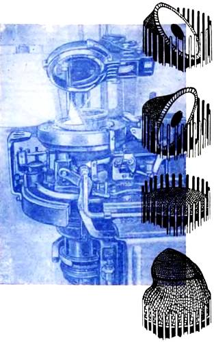 Как он работает? Посмотрите на рисунки. На первом из них показано, как начинает автомат вязку носка. Кстати сказать, автомат вяжет носки не в том порядке, как вязальщицы, а как раз наоборот, с мыска. И пока головка (в виде круга — видите?) вяжет мысок, она медленно приподнимается. На втором рисунке вы видите, как вяжется мысок и как получается у него угол без остановки вязки. А на третьем рисунке — мысок готов, он натянут между большими иглами. Теперь в дело должны вступить большие спицы-иглы, которые продолжит вязку основной чисти носки. Пока головки круг вращалась, они автоматически «пересадила» вязку со своих крючков на большие иглы, и вязка продолжается без всякого перерыва! В том, что машина приобрела подвижность и автоматическую «пересадку» вязки с одних игл на другие, и заключается «изюминка» нового автомата.