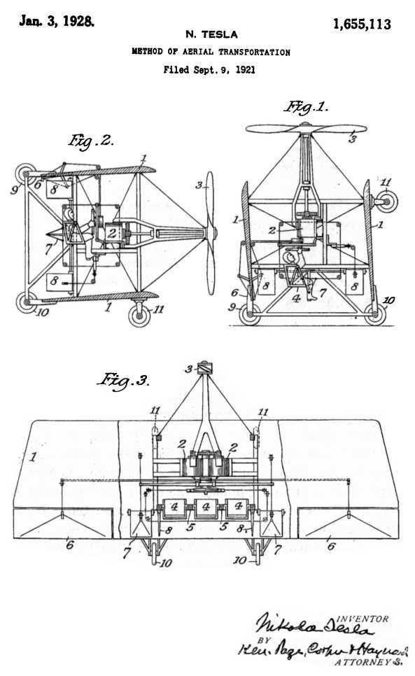 Всего через два года после того, как состоялся полет бразильца Альберто Сантоса-Думонта в Париже на его знаменитом самолете 14-bis, а братья Райт запатентовали в США свой аэроплан, Тесла задумал самолет, который мог бы взлетать и садиться на плоскую крышу здания, во двор или на палубу корабля.
