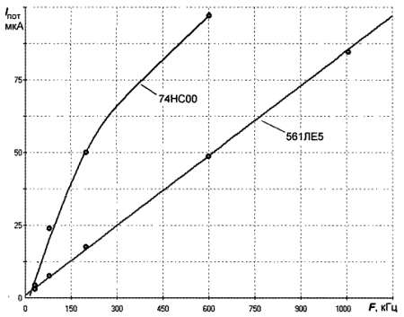 Рис. 15.2. Потребление КМОП-микросхем в расчете на один логический элемент в зависимости от частоты (напряжение питания 5 В)