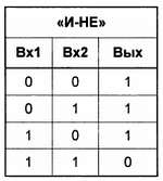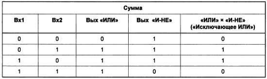 Для переноса имеем полное совпадение с функцией «И». То есть, для того чтобы обеспечить перенос, нам нужен всего лишь один логический элемент «И», который получается комбинированием стандартного «И-НЕ» с инвертором[21]. Хуже с разрядом суммы: первые три значения обеспечивает элемент «ИЛИ», однако при сложении единиц возникает несоответствие (логическое и арифметическое сложения, как мы говорили, не адекватны друг другу). Нужен специальный элемент, который мог бы получить название элемент несовпадения: в самом деде, у него логическая единица на выходе тогда, когда входы имеют разное состояние, а если они одинаковы — на выходе ноль. Для того чтобы его сконструировать, взглянем на таблицу истинности элемента «И-НЕ» (для наглядности я повторю и ее):