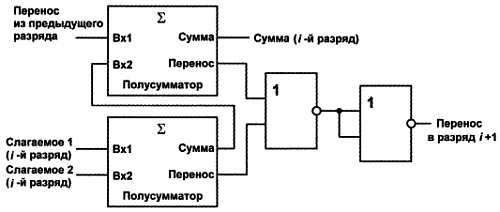 Однако почему там написано «полусумматор»? Такой одноразрядный сумматор носит название полусумматора, потому что он не «умеет» одной важной вещи, а именно: разряд переноса-то он выдает, а вот учесть перенос от предыдущего разряда не может. Поэтому, чтобы складывать многоразрядные числа по-настоящему, нужно в каждом разряде поставить по два таких полусумматора, причем объединить их выходы переносов через «ИЛИ» (рис. 15.7).