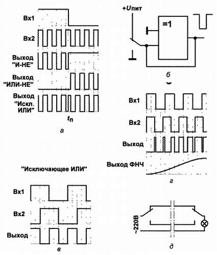 в и г — использование элемента «Исключающее ИЛИ» для выявления разности фаз (в) и частот (г) сигналов;