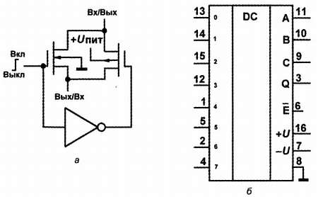 Такие мультиплексоры/демультиплексоры делают на ключах — специальным образом включенных полевых транзисторах по технологии КМОП. Простейший такой ключ изображен на рис. 15.9, а. Выпускаются также и микросхемы, содержащие просто наборы отдельных ключей, — например, 590КН2 и аналогичные, мы еще с ними столкнемся. Такие ключи широко используются в составе микросхем средней и большой степени интеграции — в аналого-цифровых и цифроаналоговых преобразователях, например. Также они практически заменили механические переключатели в коммутаторах телевизионных каналов, используются в цифровых переменных резисторах, электронных реле и т. д.