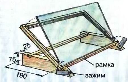 Подберите к рамке прозрачное стекло. Позаботьтесь, чтобы оно плотно входило в пазы. Для надежности прикрепите к скосам стоек простейшие зажимы — деревянные или металлические, завинтите их шурупами как можно туже, чтобы они с трудом открывались и закрывались.