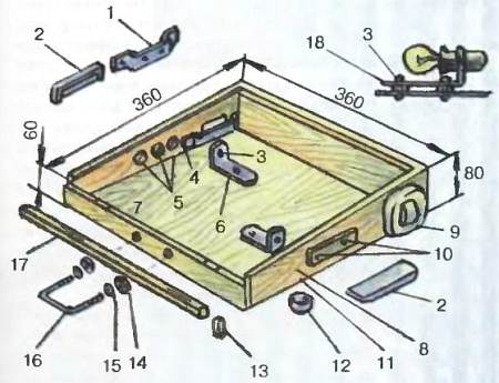 1 — планка; 2 — крышка для вентиляционных отверстий; 3 — кронштейн; 4 — овальное отверстие пол электропроводку; 5 — вентиляционные отверстия в левой стенке ящика; 6 — вентиляционное отверстие в дне ящика; 7 — металлические петли; 8 — правая стенка; 9 — ceтевой выключатель; 10 — шурупы; 11 — дно ящика; 12 — резиновая ножка (4 дет.); 13 — крючок для откидной планки; 14 — шестигранные гайки; 15 — круглые гайки; 16 — П-образная ручка; 17 — откидная планка; 18 — прокладки из металлических шайб.