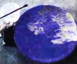 Смешайте краски синего и белого цветов в соотношении 3:1. Полученным колером покройте тарелку. Дайте краске просохнуть, а затем слегка протрите поверхность наждачной бумагой. А теперь вам предстоит операция, которую надо выполнить быстро и безукоризненно.
